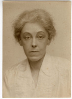 Photograph of Charlotte Mew, undated Undated black-and-white photograph of Charlotte Mew. Mew wears her light-colored hair short and wears a white dress.
