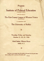 Program of the Institute of Political Education 1926 Full program of events and speakers at the Institute of Political Education held under the auspices of the Erie County League of Women Voters in cooperation with the University of Buffalo on October 21, 22, 23, 1926 at the Hotel Statler, Buffalo, New York. Political Institutes were conducted by the League of Women Voters in conjunction with the University of Buffalo to fulfill the League's mission to educate citizens in government and politics and were, therefore, open to the general public as well as to League members.