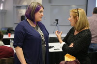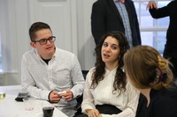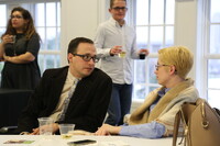 People talking Person standing at table where two others are sitting.