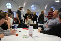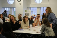 People People seated at tables looking at a screen at the front of the room.