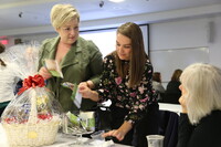 People People gathered around a table on which is a gift basket.