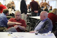 Men talking Two men sitting at a table talking with people in the background.