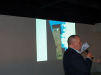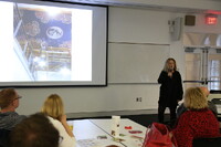 People People seated at tables looking at a screen and a person presenting at the front of the room.