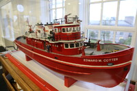 Boat Model of a boat named "Edward M. Cotter" in a display case in front of windows.