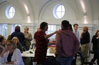 Group of people People standing and talking and people sitting at tables