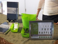 Free raffle A table with several items on it, including a sign that says "Free Raffle". Part of a person is visible on the other side of the table. -