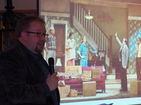 Person holding a microphone in front of a screen -