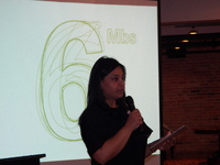 Person holding a microphone in front of a screen showing the 6Mbs logo -