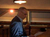 Person holding a microphone Person holding a microphone, standing in front of a screen that shows the 6Mbs logo -