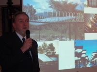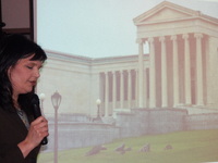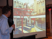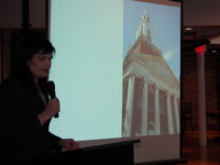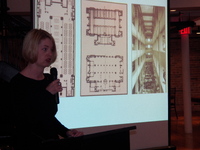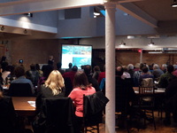 Audience looking toward speaker and screen -