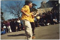 Group of students, 2000 Color photograph of a group of students performing at an event outside of Goodyear Hall on South Campus, 2000.