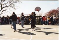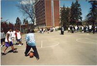 Group of students, 2000 Color photograph of a group of students at an event, playing basketball outside of Goodyear Hall on South Campus, 2000.