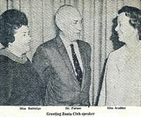 Zonta guest speaker Dr. Clifford C. Furnas, President Emeritus of the University of Buffalo, is flanked by Buffalo Zonta's First and Second vice presidents Participants in the Buffalo Zonta luncheon at which University of Buffalo President Emeritus Clifford C. Furnas (center)was guest speaker included: Buffalo Zonta First Vice President Miss Allalee A. Babbidge (left) and Buffalo Zonta Second Vice President Miss Jeannette Scudder (right)