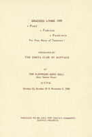 Program cover for Zonta's Gracious Living 1959 project to benefit Zonta's Community Service Projects Buffalo Zonta's Gracious Living 1959 program featured the latest in food, fabrics and fashions for the home of tomorrow