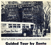 Tour bus waits in front of the Buffalo Red Cross headquarters for its Zontian tour guide as a part of Zonta's program of community service Buffalo Zonta adopted a four-pronged program of service to others in 1960 that was carried out on an annual basis via a series of guided tours to various service organizations in the Buffalo area. Year-round sponsorship of these tours was provided by the United Community Chest and Red Cross Appeal and acquainted tour participants with the value gleaned from community investment in handicapped rehabilitation, placement of children in loving foster homes, training in first-aid and home-nursing, family counseling and senior citizen support.