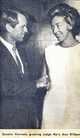 Buffalo Zontian Judge Mary Ann Killeen shakes hands with Senator Robert F. Kennedy upon his 1968 visit to Buffalo Buffalo Zontian Judge Mary Ann Killeen was selected to greet Senator Robert F. Kennedy when he visited Buffalo, New York as a part of his presidential campaign in the summer of 1968. Robert F. Kennedy was assassinated shortly after midnight on June 5, 1968 in Los Angeles, California
