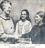 Buffalo Zonta President Miss Dorothy W. Grauer awards scholarships to two college students pursuing studies in the health science field Miss Dorothy Grauer (left), Buffalo Zonta President, shaking hands with two Zonta education grant winners: Miss Kathleen A. Murray (center) and Miss Mildred M. Travis (right) who are both nursing students at D'Youville College, Buffalo, New York