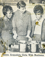 Buffalo Zontian Miss Janice M. Kelly demonstrates job skills to teenage girls as part of a special Zonta project to acquaint young women with the real world of business Janice M. Kelly (center) displayed food preparation techniques to two of the 75 local teenage girls who participated in the 1965 Zonta career day (Marie L. Brokenburr (left) and Lillian D. Williams (right)