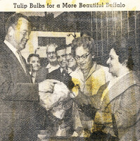 Miss Margaret J. Barry, representing Buffalo Zonta, accepts tulip bulbs for Buffalo beautification in honor of First Lady Mrs. Lyndon B. Johnson's visit Mrs. Lyndon B. (Ladybird) Johnson's visit to Buffalo, New York in 1965 motivated distribution of 25,000 tulip bulbs as a part of a beautification initiative. Distributing the bulbs for planting are: C. Edward Berryman (far left) of Marine Midland Trust Co. and receiving the bulbs (from right, foreground) are: Miss Edna Habicht of Children's Hospital and Miss Margaret J. Barry (second from right) of Buffalo Zonta Club.