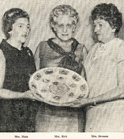 Zontian Mrs. Sidney Main displays a Passover dish with Buffalo Zonta President Mrs. Walter J. (Esther) Rick during a tour of Temple Beth Zion Buffalo Zonta was the first women's civic group to have luncheon and a tour of the rebuilt Temple Beth Zion. Participants included (left to right): Zontian and temple member Mrs. Sidney Main, Buffalo Zonta President Mrs. Walter J. (Esther) Rick and tour guide Mrs. Joseph N. Desmon, wife of the temple congregation president.