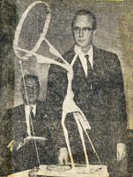 Sculptor Larry W. Griffis, Jr. and a model of his controversial design for 'The Spirit of Womanhood' statue honoring Zonta founder Marian de Forest Larry W. Griffis, Jr., designer of the proposed bronze statue 'The Spirit of Womanhood' to honor Zonta founder Marian de Forest, posed with a model of his creation at the Buffalo City Planning Board Meeting in City Hall in 1961. Griffis was the creator of the first sculpture park in the United States 'Griffis Sculpture Park' in Cattaraugus County, New York which also serves as a nature preserve.