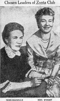 Miss Ethel M. Chandler and Mrs. Herbert (Ella) Knight were elected to lead Buffalo Zonta for 1959-1960 Chosen leaders of Buffalo Zonta for 1959-1960 were (left to right): Miss Ethel M. Chandler as president and Mrs. Herbert (Ella) Knight as first vice president