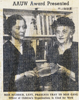 Buffalo Zontian E. Marguerite Gane receives the AAUW Award for her work as an officer in children's organizations E. Marguerite Gane (right), a longtime Zontian and executive secretary of Children's Aid and Society for the Prevention of Cruelty to Children is presented with her award by the branch president Miss Jeannette Scudder (left) for her good works.