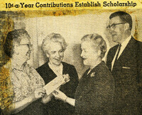 Buffalo State College scholarship is named in honor of long-time Buffalo Zontian Mary S. Switzer Mary S. Switzer, Home Demonstration Agent for Buffalo and Erie County for 25 years, was instrumental in collecting 10 cent per year contributions from all members of the home demonstration units of the Buffalo and Erie County Extension Service since 1954 in order to establish a scholarship for a home economics student at Buffalo State College. Pictured (left to right) at the presentation ceremony were: Mrs. Edwin J. Hall, Mrs. Mary S. Switzer, Dr. Margaret A. Grant, Director of the Home Economics Division, Buffalo State College and Dr. Paul G. Bulger, President of Buffalo State College