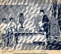Buffalo Zontian Mary Barrett Healy prepares costumes for young twin students in anticipation of the Studio Theatre School season opening Mary Barrett Healy was the Director of the Studio Theater School in Buffalo, New York, one of the few community theaters in the United States which conducted its own training schools for its students. Young twin drama students Michelle and Micheline Lepine delight in the period costumes of the productions.