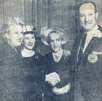 Zontian pilot Jacqueline Cochran is honored at a luncheon hosted by Zonta President Mrs. Andrew Switzer on Buffalo's 'Jacqueline Cochran Day' Buffalo Zontian Statler Hilton March 17, 1959 luncheon included (left to right): honoree Jacqueline Cochran, luncheon chairman Martha Torge, Buffalo Zonta president Mrs. Andrew (Mary S.) Switzer and Ad Club president Ivan Levine