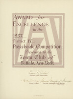 Award for Excellence in the 1957 District IV Press book Competition Annual awards for maintaining a pressbook was presented by each district within the Zonta International organization