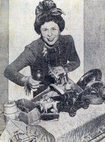 Committee Chairman Mrs. John P. (Elena G.) Dwyer displays scrap metal collected by Zontians to support the 1942 war effort Buffalo Zonta, under the committee chairmanship of Elena G. Dwyer, contributed unusual metal scrap to the war drive including a steel casket, old fashioned iron, a bracelet of keys and a toy cannon.