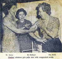 Buffalo Zontian volunteer Mrs. Marie B. Keefe receives her polio shot with a large needle to emphasize the importance of inoculation Dr. Grace T. Hansen (left) and Dr. Ellen Rudinger (center) of the Erie County Health Department shoot Buffalo Zontian volunteer Mrs. Marie B. Keefe with polio vaccine to emphasize the importance of inoculation against the disease