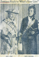 Buffalo Zontians present their own comic version of 'What's Your Line?' at a Statler luncheon Buffalo Zontians Betty L. Senf (left) and Dorothy W. Grauer dressed in elaborate costumes representing diverse professions appropriate to a game of 'What's my line?'