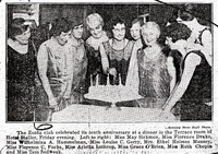Zonta leaders cut the cake at their tenth anniversary celebration in the Hotel Statler Terrace Room Notable Buffalo Zontians who gather to cut the cake at their 10th anniversary dinner include (Left to right): May C. Sickmon, Florence Drake, Wilhelmina A. Hammelman, Louise C. Gerry, Ethel Holmes Munsey, Florence G. Fuchs, Arletta M. Lothrop, Grace O'Brien, Ruth Palmer Chapin and Tess Sedweek