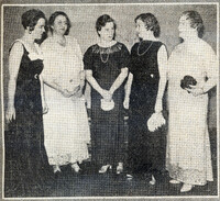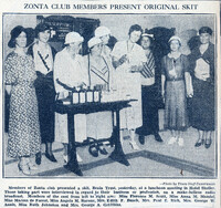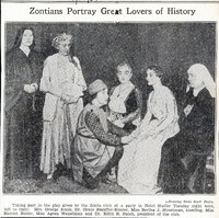 Buffalo Zontians portray the great lovers of history at a 1934 Hotel Statler party Taking part in the play portraying great lovers of history were (left to right): Mrs. George Annis, Dr. Grace Stauffer-Knaier, Bertha J. Strootman (kneeling), Harriet L. Butler, Agnes Wesselman and Buffalo Zonta President Dr. Edith Hatch