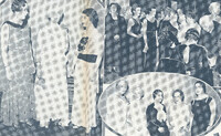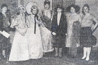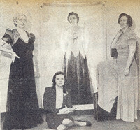 Zontians display historical fashions from a Buffalo Centennial pageant authored by honorary Zontian Josephine Wilhelm Wickser Buffalo Zontians that appeared in Josephine Wilhelm Wickser's pageant were (left to right): announcer Josephine Wilhelm Wickser, Agnes Wesselman, Helen Kennedy, Ruth Palmer Chapin, Mrs. George A. Griffiths, Mrs. Paul J. Rich and Anna Mandel