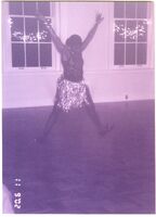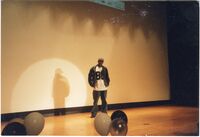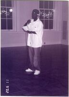 Performer at event, 2002 Black and white photograph of a performer at Black Student Union event on South Campus in 2002.